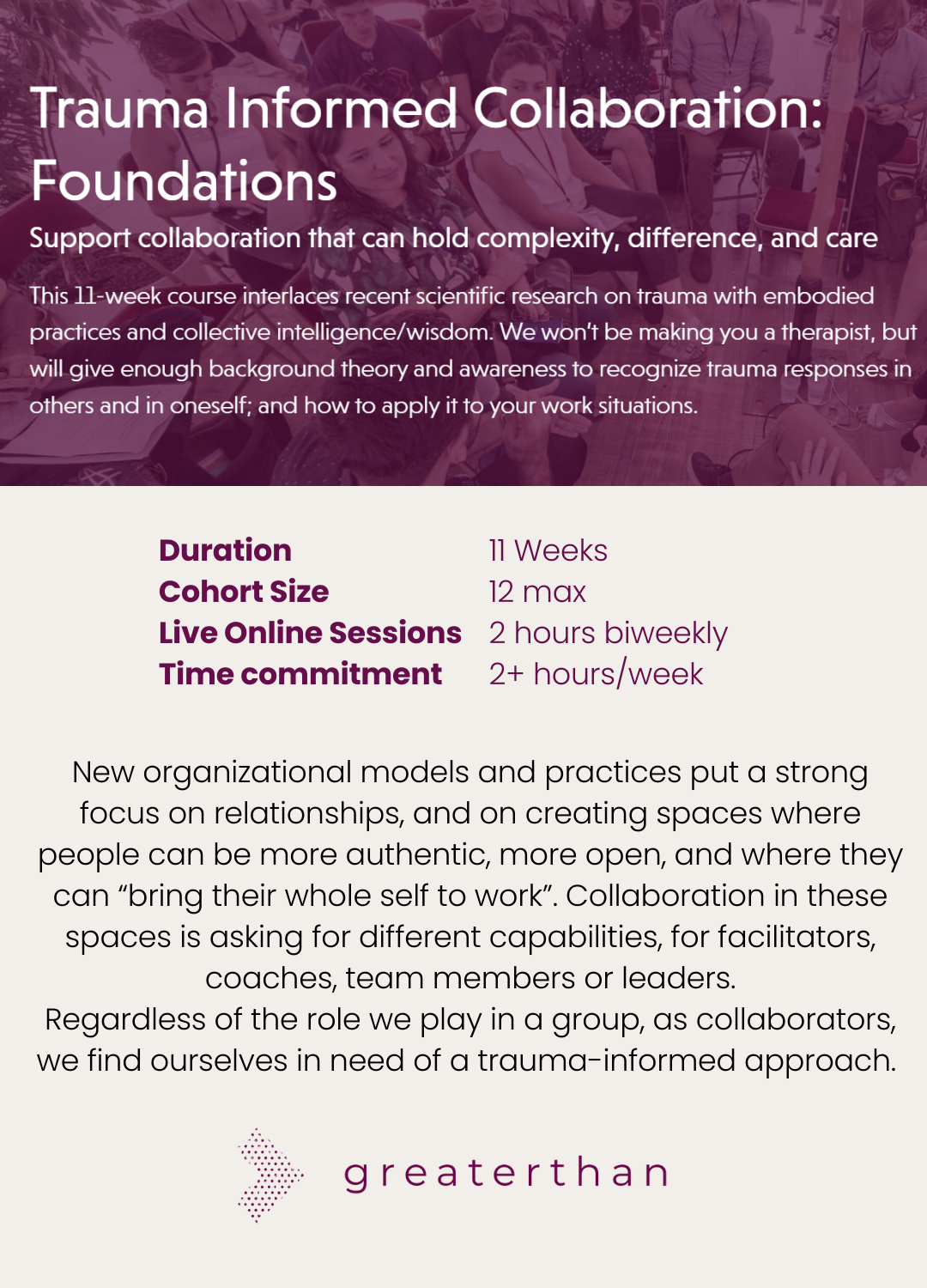 Online, new dates TBCOver the 11 weeks, the full group will meet 6 times for 2 hours and 1 time for 1 hour with Community of Practice